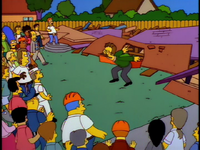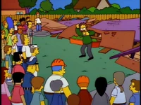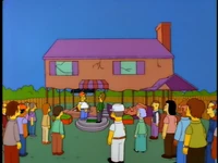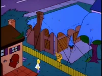 The following day, Marge arrives at the church and takes the Flanders family back to their house, completely rebuilt by the people of Springfield. Overjoyed, Flanders inspects the house, but saddens after examining its extremely shoddy construction. The house soon collapses, causing Flanders to finally snap. Expressing his deep anger for the first time in the show, he 'tells off' (slanders) all the residents of Springfield and directs his most vehement invective at Homer (who believes he got off easy). Ned then drives himself to Calmwood Mental Hospital to seek therapy.